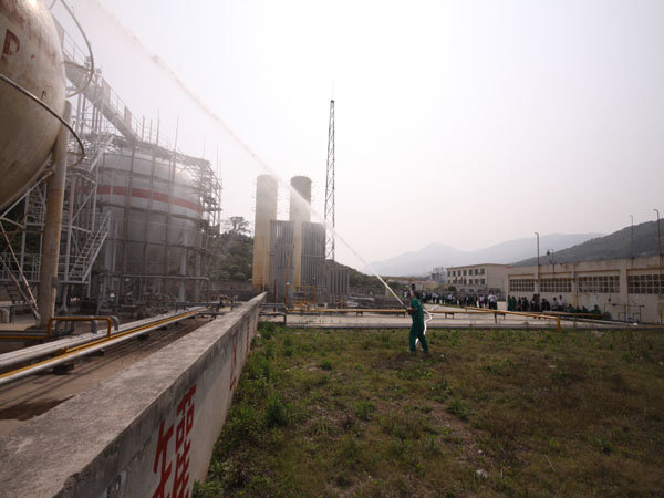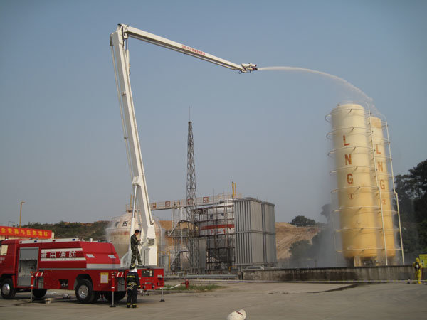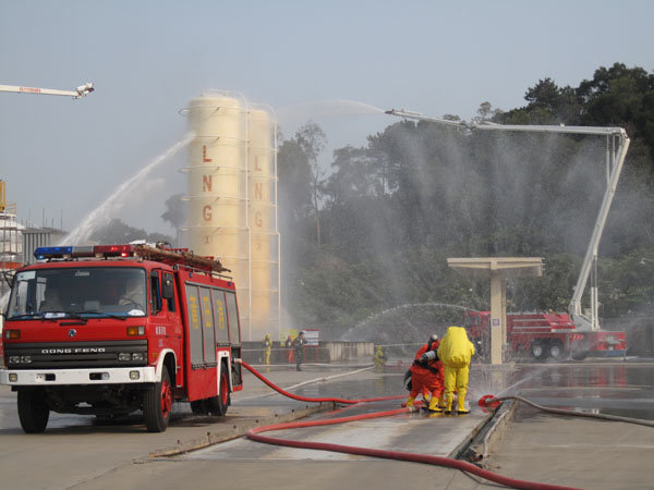 15:30分,隨著生產(chǎn)部報(bào)警聲響起,LNG灌區(qū)發(fā)生泄漏,現(xiàn)場指揮接警后立即按響報(bào)警器,指揮相關(guān)小組啟動(dòng)消防水泵,對灌區(qū)進(jìn)行緊急噴淋,隔離相鄰儲罐,并組織員工按預(yù)定區(qū)域到達(dá)避難位置。市消防派出2輛高噴消防車、6輛水罐消防車到達(dá)起火現(xiàn)場,火情偵檢組隨即展開偵檢,先用泄露儀對現(xiàn)場進(jìn)行濃度檢測,并用隔離帶劃出相應(yīng)的警戒線,保安配合警戒組疏散區(qū)域內(nèi)無關(guān)人員及在場使用中的車輛熄火,同時(shí)關(guān)閉大門,禁止除消防車、搶險(xiǎn)車外的一切車輛出入。在得知了著火位置和泄漏程度后,中隊(duì)指揮員立即下令,展開滅火行動(dòng)。消防隊(duì)員穿上消防戰(zhàn)斗服、佩戴防毒面具和呼吸器、攜帶銅質(zhì)工具和滅火器材迅速趕往事故儲罐,關(guān)閉儲罐根部所有閥門。而其余消防車按照預(yù)期指定位置,全方位對LNG灌體進(jìn)行火災(zāi)撲救。